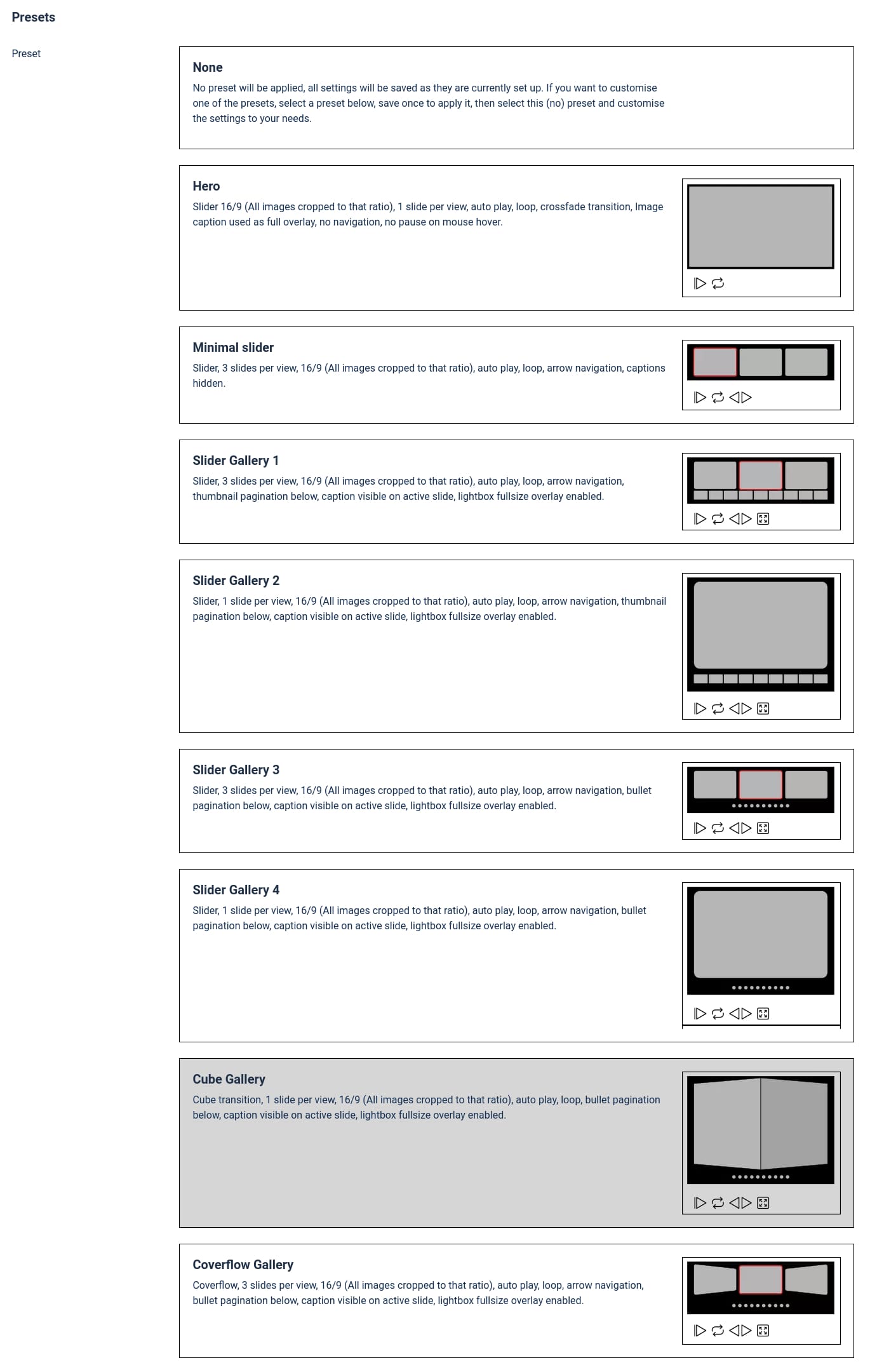 With CW-swiper you can select one or more image folders as source and have a nice slideshow, gallery or site-hero up and runnning within a few minutes. The CW-swiperXP plugin extends CW-swiper by an image manager, where you can select and organize single images and add captions to them. The plugin also comes with a whole host of ready to use presets, which makes it even easier to get going without having to configure every single parameter by hand. The presets are also a great starting point which then can easily be customised to fit your needs.